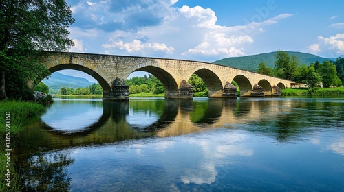 Fototapeta premium Serene Reflections: Classic European Bridge Over Tranquil River