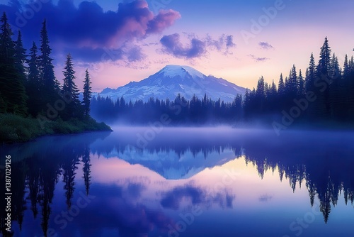 © Serhii, Fototapeta premium Serene Reflections of Mt Rainier at Dawn: A Colorful Calm with Early Morning Fog and Blue Skies Over a Lush Forest