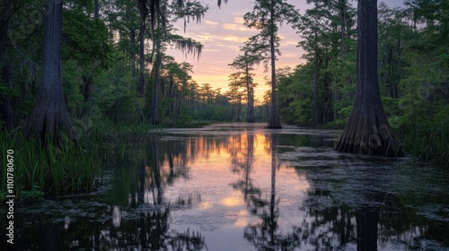 Naklejka premium Serene reflections of trees on still wetland waters at dusk, with soft orange...
