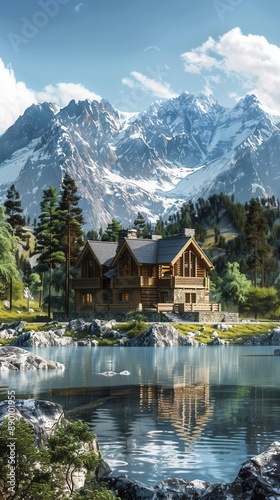 © Irfanan, Fototapeta premium Serene Retreat. Mountain home offering fresh air and tranquility