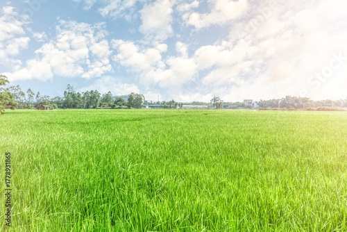 © Narkyy Image, Fototapeta premium Serene Rice Field and Grassland Landscape Golden Hour Light