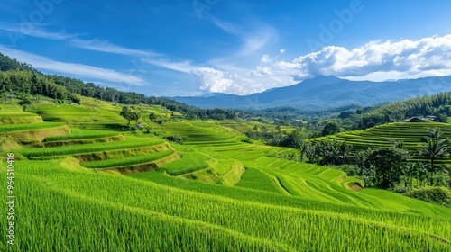 © PalaG, Fototapeta premium Serene Rice Terrace Landscape with Distant Mountains and Blue Sky