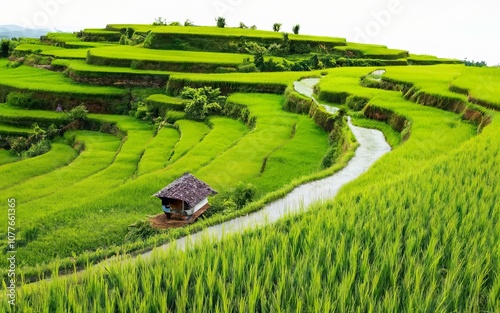 Fototapeta premium Serene Rice Terraces: A winding path meanders through vibrant green rice terraces, leading to a quaint hut nestled amidst the lush landscape.