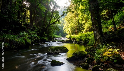 Fototapeta premium Serene River Flowing Through Lush Forest