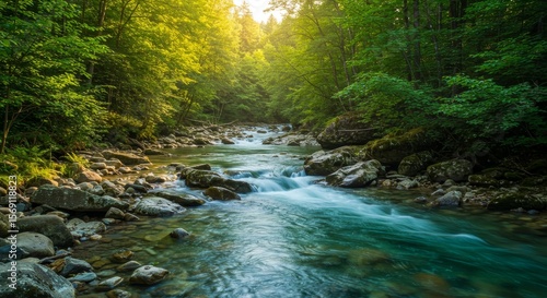 © AlifBastyawan, Fototapeta premium Serene River flowing through lush green forest