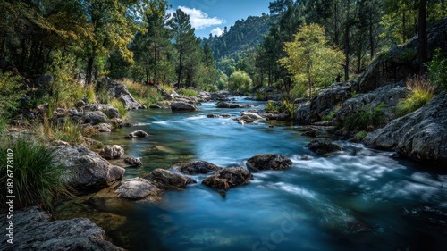 © Songsak, Fototapeta premium Serene River Flowing Through Lush Green Forest Landscape