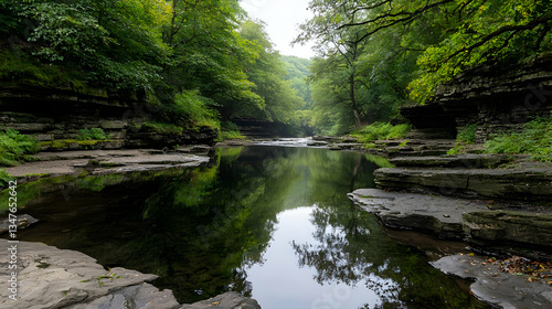 Naklejka premium Serene River Flowing Through Lush Green Forest with Rock Formation and Clear...