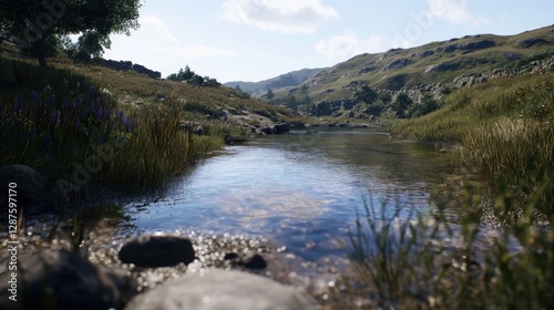 Fototapeta premium Serene river flowing through lush green hills under a clear blue sky with...