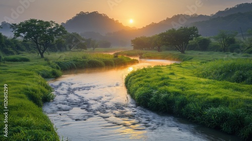 © Rashidi, Obraz premium Serene River Flowing Through Lush Green Valley