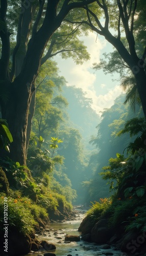 © vadosloginov, Obraz premium Serene river flowing through lush jungle landscape