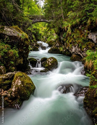 © ruliana, Fototapeta premium Serene River Flowing Under Stone Bridge in Lush Green Forest.