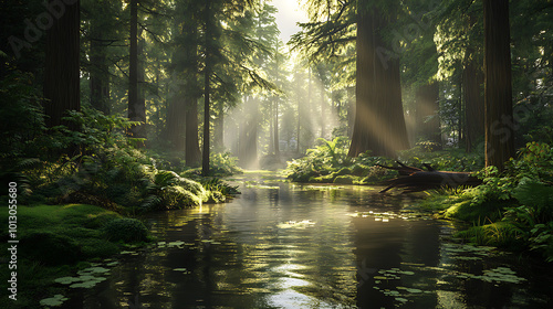 Obraz premium serene river flows through lush forest, illuminated by soft sunlight