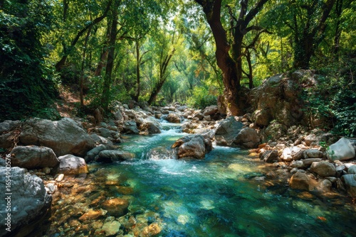 Naklejka premium Serene river flows through lush green forest landscape in summer nature scene with rocks and trees
