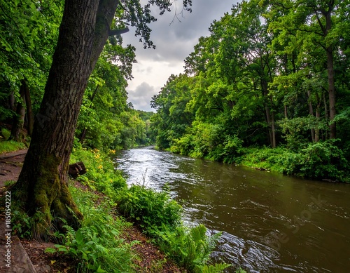 © Zakia, Naklejka premium Serene river flows through lush green forest under cloudy sky