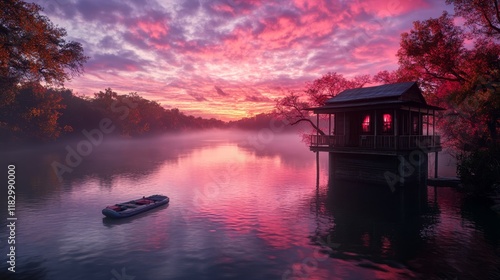 © Fragton, Fototapeta premium Serene River House Sunset Landscape with Inflatable Boat