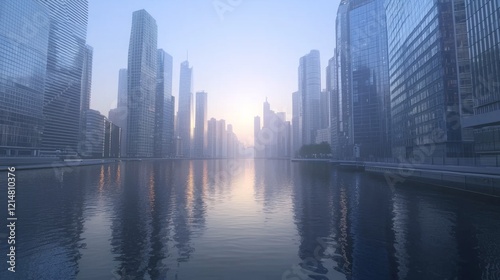© Jakkarin, Naklejka premium Serene River Journey: Boat Deck View of Reflective Skyscraper Brilliance - Ultra-Detailed Cinematic Image
