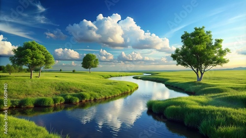© Arnada, Obraz premium Serene River Landscape 4K Minimalist Video: Lush Green Grass, Blue Sky, Flowing Water, Nature Scenery