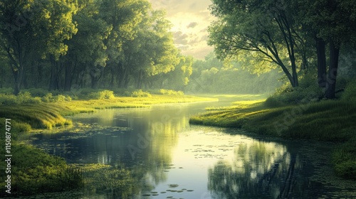 Obraz premium Serene River Landscape: Tranquil Waters Reflecting Sunlight Through Lush...