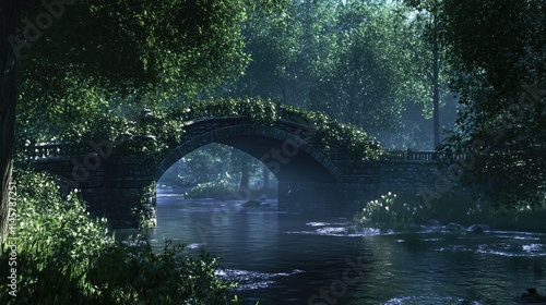 © Holo Frame, Fototapeta premium Serene river landscape with a historic stone bridge surrounded by lush greenery and soft morning light.