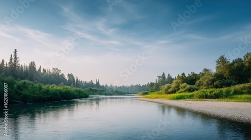 Fototapeta premium Serene river landscape with lush greenery and gentle ripples reflecting the sky, creating a peaceful natural environment for relaxation