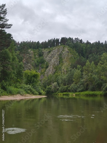 © Irinka Dimkovna, Fototapeta premium Serene River Landscape with Lush Greenery and Rocky Cliffs Under a Cloudy Sky, Perfect for Tourism