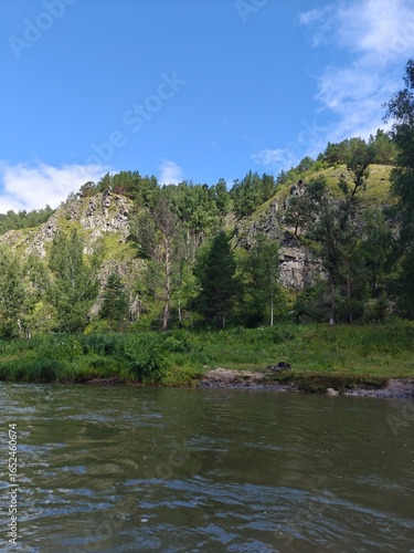 © Irinka Dimkovna, Fototapeta premium Serene River Landscape with Lush Greenery and Rocky Cliffs Under Blue Sky