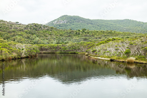 Obraz premium Serene River Reflecting Lush Green Hills, Tidal River, Wildons Prom, Australia