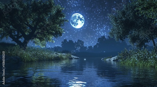 © Platoo studio, Naklejka premium serene river reflecting starry night sky and full moon