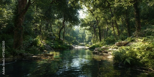 Naklejka premium Serene River Running Through Verdant Forest
