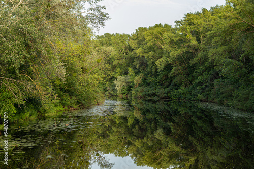Fototapeta premium Serene river scene with dense, green forest on both shores, clear reflection...