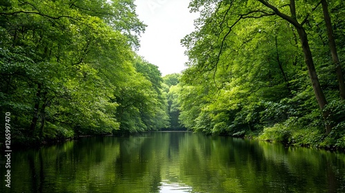 © artzone, Fototapeta premium Serene River Scene With Lush Green Trees And Calm Water