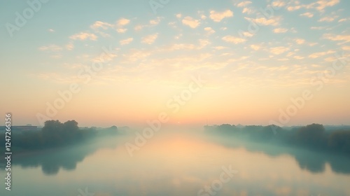 © gingsulku, Fototapeta premium Serene River Sunrise Mist Soft Cloudscape