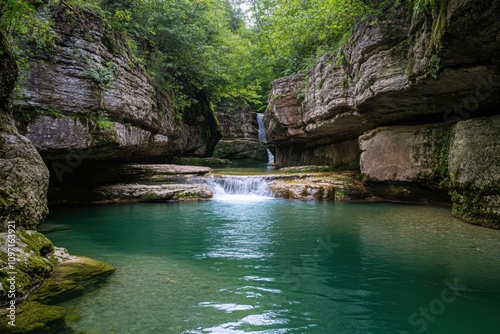 Fototapeta premium Serene river surrounded by lush greenery and rugged cliffs in a tranquil forest setting