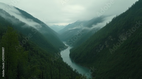 © Big9869, Fototapeta premium Serene River Valley Enveloped in Misty Mountains