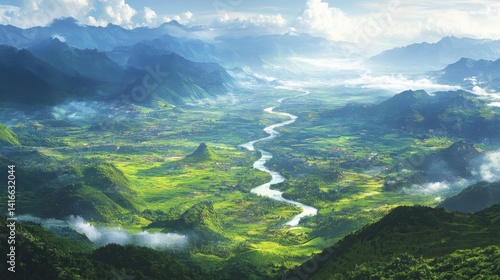 © UtkarshBay, Fototapeta premium Serene River Valley Landscape with Lush Green Mountains