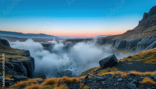 © Kitta Studio, Fototapeta premium Serene River Valley with Misty Fog and Dramatic Mountain Landscape