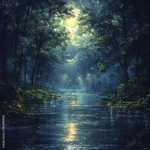 © Biancaart, Fototapeta premium Serene river view illuminated by ethereal light through a dense forest