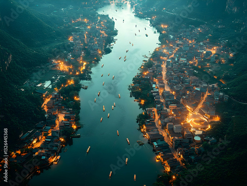 © abid, Obraz premium Serene river village at dawn