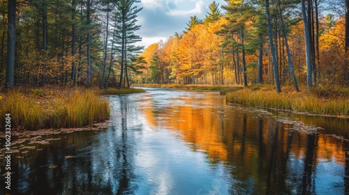 © Adil, Fototapeta premium Serene river winding through a forest tall pines, with the reflections autumn leaves shimmering on the water's surface