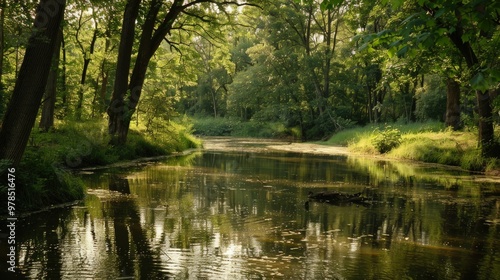 © Mahavira Osa, Obraz premium Serene River Winding Through Lush Forest