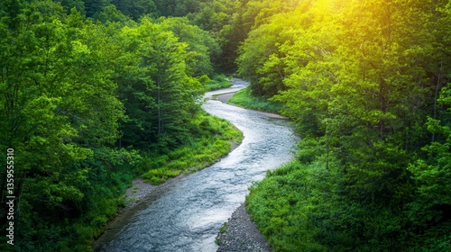 © Narongsag, Obraz premium Serene River Winding Through Lush Green Forest Nature Photography