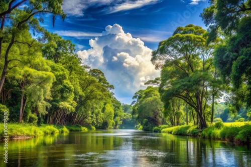 © Arethaawykoff, Obraz premium Serene Riverbanks Surrounded by Lush Greenery and Towering Trees Under a Clear Blue Sky