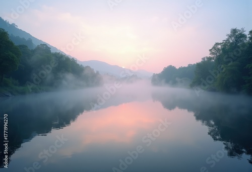 Fototapeta premium Serene Riverside Fog Dawn Tranquil Water Reflection Misty Nature Scene...