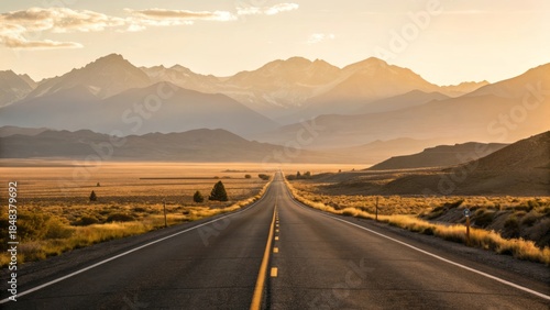 © Nongkran, Obraz premium Serene Road Leading to Majestic Mountains Under Soft Golden Sunrise Light