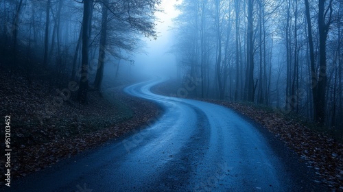 Naklejka premium Serene road through a foggy forest, monochromatic, high contrast, moody atmosphere, mystical allure