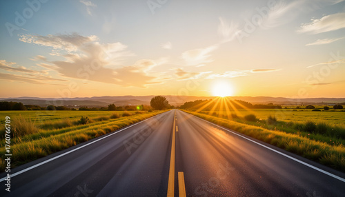 © Anna K@S, Fototapeta premium Serene road winding through green fields under sunrise sky