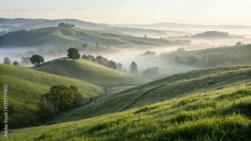 © AnotharS, Obraz premium Serene rolling hills shrouded in morning mist under a soft sky.