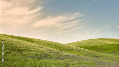 Fototapeta premium Serene rolling hills under a clear sky with subtle wildflowers ideal for...