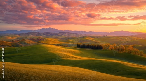 © 69, Obraz premium Serene Rolling Hills Under Colorful Sunset Sky in Tuscany Landscape