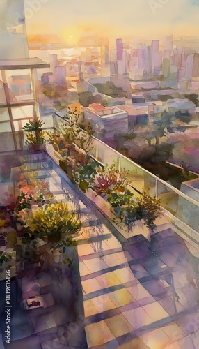 Obraz premium Serene rooftop garden sunset cityscape watercolor painting evokes peaceful...